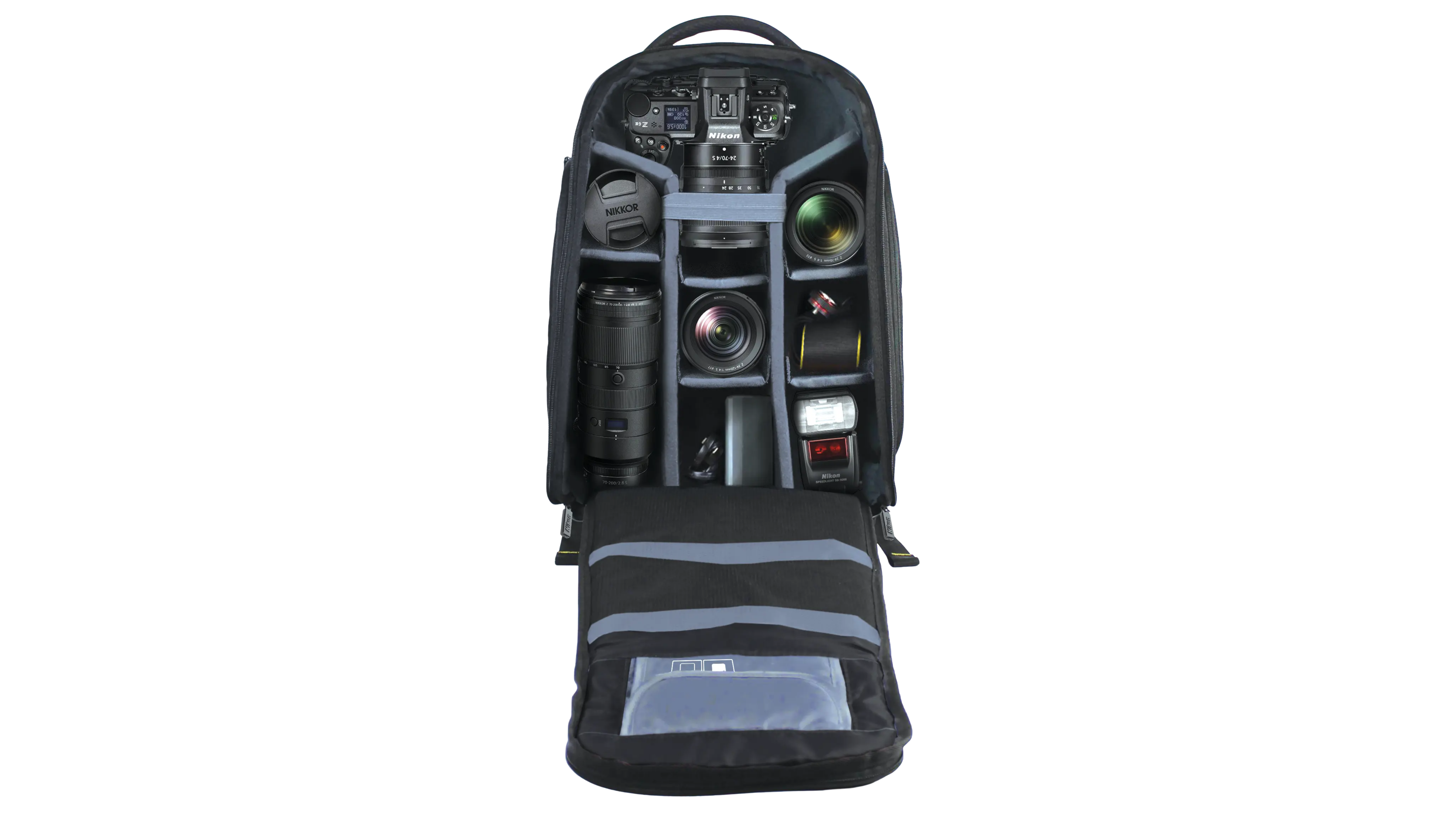 Lo zaino Premium Explorer Backpack è progettato per contenere e proteggere la tua fotocamera Nikon, il treppiedi e l'attrezzatura fotografica necessaria per la tua prossima avventura. · Idrorepellente e resistente (nylon 840D) · Scomparto dedicato per tablet/laptop (fino a 17") · Copertura antipioggia riflettente integrata · Lo scomparto con cerniera completa ti permette di accedere facilmente alla fotocamera e agli obiettivi · Lo scomparto principale regolabile si adatta facilmente alla tua attrezzatura fotografica · Dimensioni esterne: L 470 x H 310 x P 190 mm · Dimensioni interne (scomparto fotocamera e obiettivo): L 450 x H 275 x P 150 mm · Compatibilità (elenco indicativo): Serie Z5, Serie Z6, Serie Z7, Z8, D850, D780