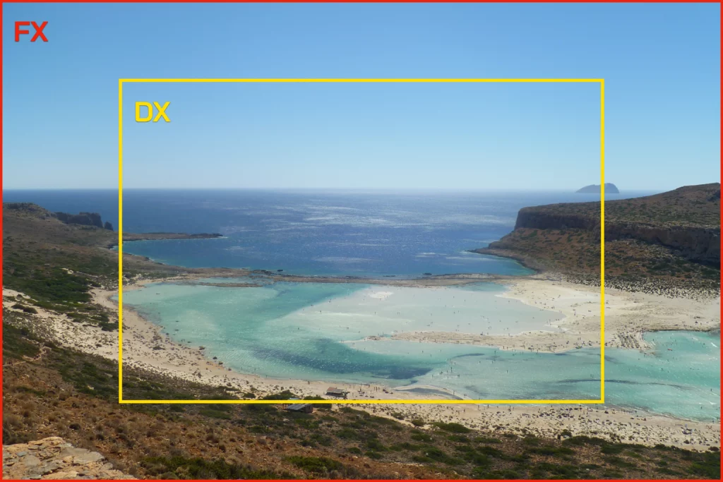 Lo stesso panorama ripreso sull’isola di Creta con una fotocamera con sensore FX (bordo rosso) e una fotocamera con sensore in formato DX (bordo giallo). L’obiettivo 28mm della FX “si trasforma” in un 42mm (28mm x 1,5) se montato su una fotocamera DX