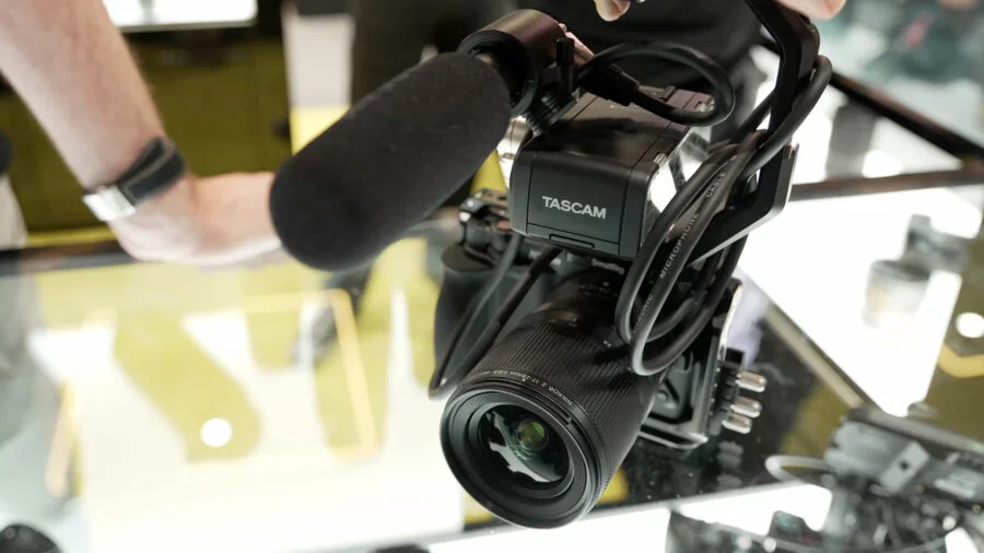 Nessun compromesso sul fronte audio: la Nikon ZR è progettata per integrarsi con un vero ecosistema di accessori. Nella foto sopra, è abbinata a un mixer audio a due canali Tascam CA-XLR2d-N. (© CineD)