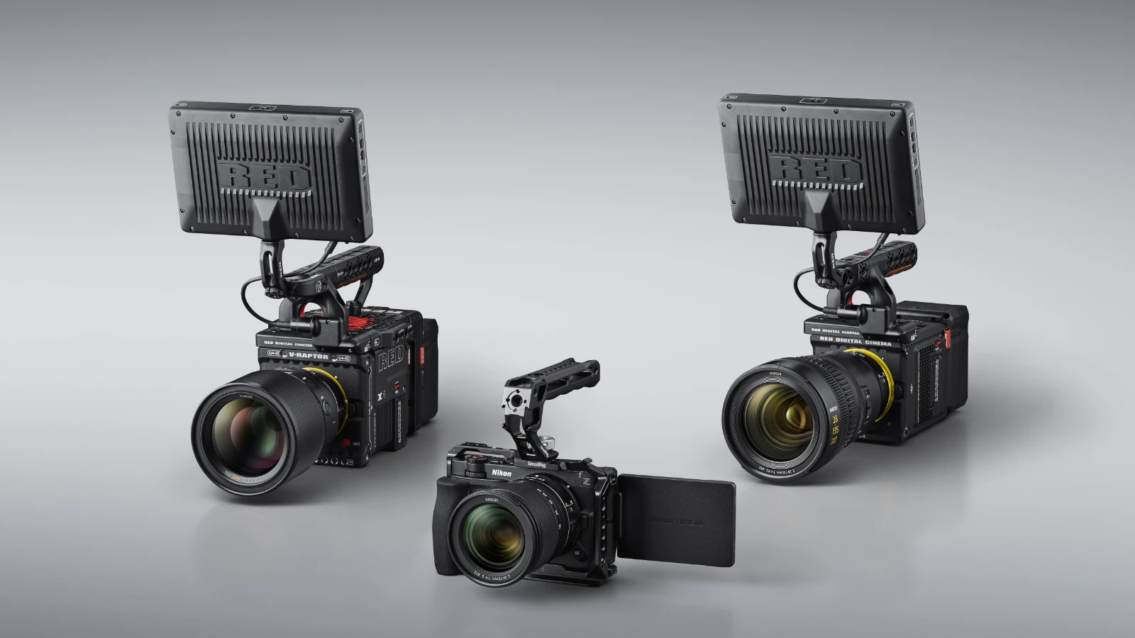 L’acquisizione di RED Digital Cinema da parte di Nikon Group ha portato dapprima a integrare l’attacco Z-mount in due delle videocamere hollywoodiane della casa americana (la V-RAPTOR [X] Z Mount, a sinistra, e la KOMODO-X Z Mount, a destra, poi a dar vita alla nuova cinema-camera Nikon ZR, al centro. L’attacco a baionetta Z-mount che le contraddistingue consente di utilizzare le oltre 40 ottiche NIKKOR già a disposizione, oltre all’infinito parco di obiettivi, grazie agli adattatori Nikon FTZ e Nikon FTZII, con attacco F-mount.